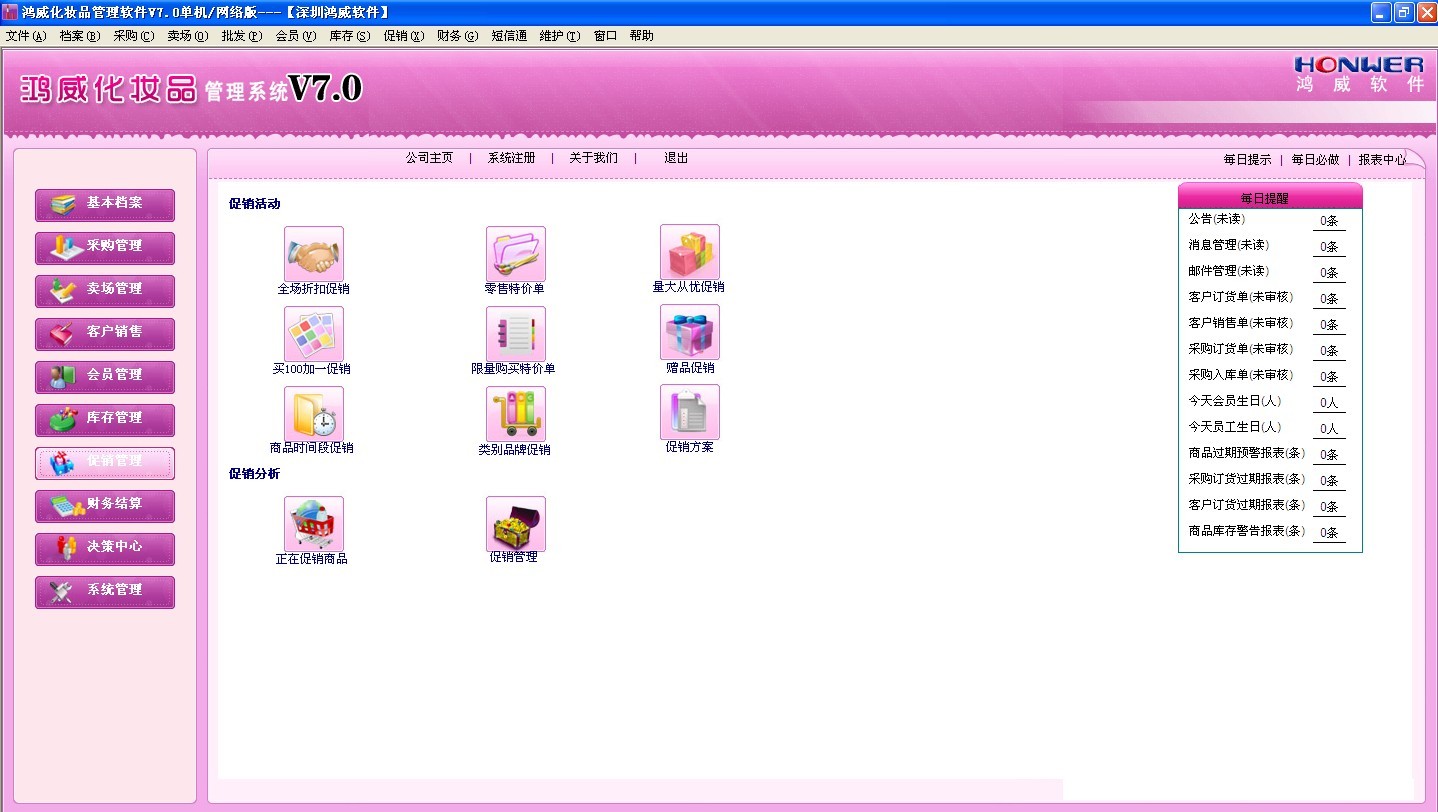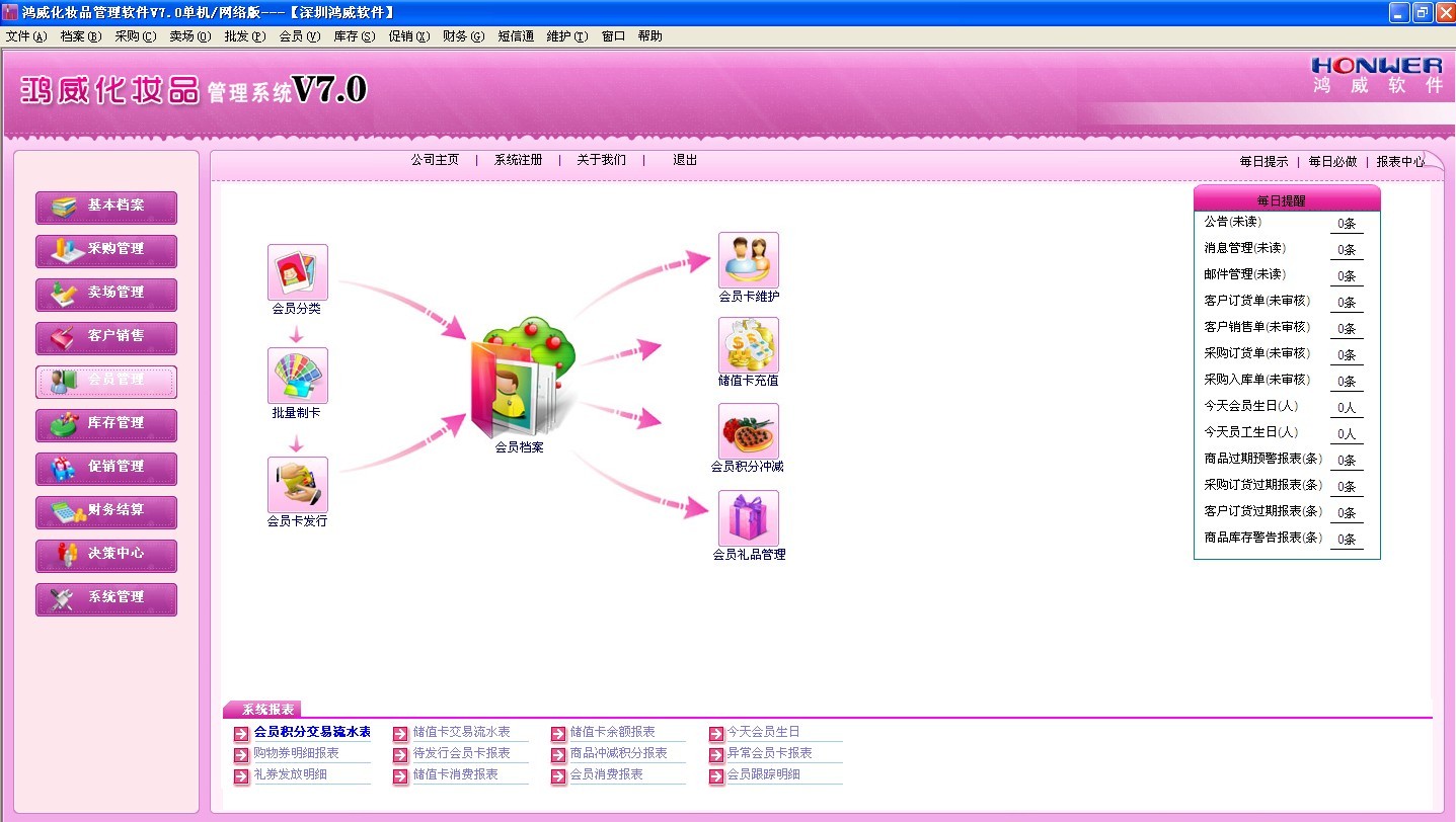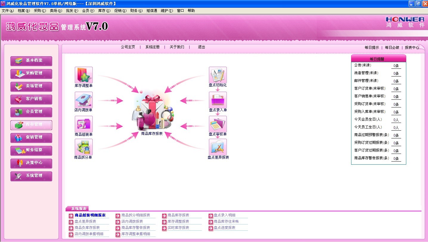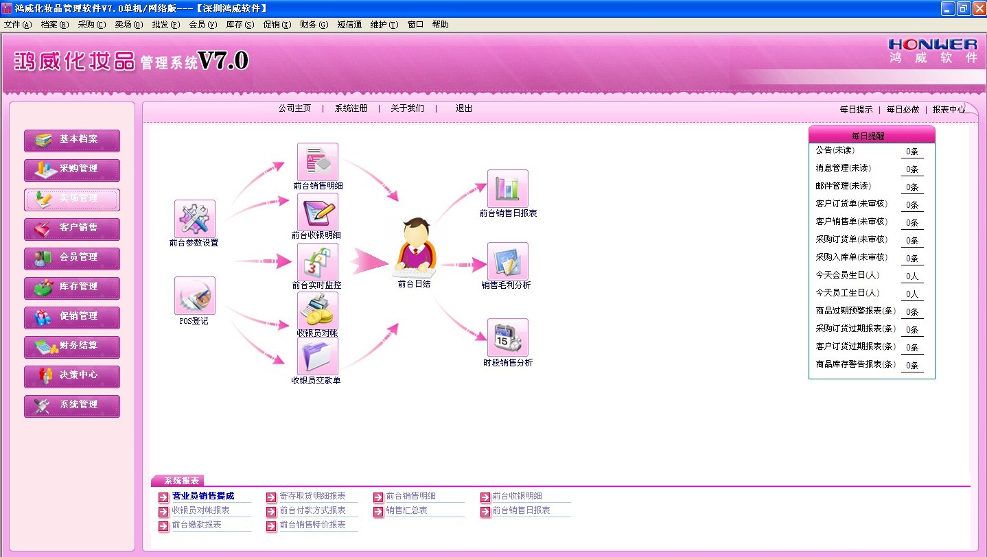 鸿威化妆品管理系统是由深圳鸿威软件有限公司结合多年的行业经验研究开发出来的现代化妆品管理系统。整个系统分为前台POS系统及后台管理系统。前台POS系统主要是实现前台的销售及收银管理;后台管理系统实现基本档案管理、采购管理、零售管理、客户销售、库存管理、财务结算、会员管理、专柜租赁、系统维护等。